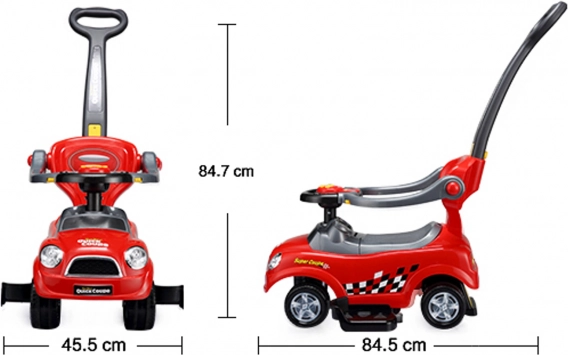 De slimme 3-in-1-oplossing biedt drie gebruiksstanden: een veilige stand met veiligheidsbeugels en voetsteunen voor de allerkleinsten, een stand met duwstang voor eenvoudige besturing door de ouder en een klassieke loopauto voor zelfstandig rijden zodra je kind met de voeten bij de grond kan. Zo is het een veelzijdig speeltje dat meegroeit met je kind en zich aanpast aan zijn of haar vaardigheden.