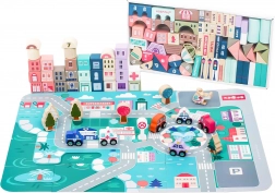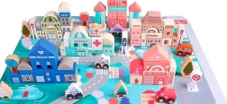 Houten blokken voor kinderen ouder dan 3 jaar zijn ideaal voor de ontwikkeling van handmatige vaardigheden en ruimtelijk inzicht. De set bevat 115 elementen, waaronder diverse gebouwen zoals hotel, ziekenhuis, bank, politiebureau, school en brandweerkazerne. Elk gebouw is gedetailleerd ontworpen en aangevuld met een bijpassend voertuig.