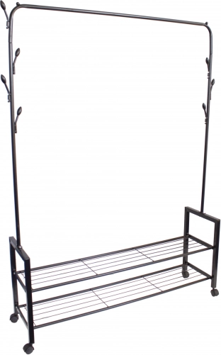 De kapstok heeft een duurzame, stabiele metalen constructie met poedercoating. De decoratieve zijhaken bieden extra plek voor het ophangen van een tas, sjaals of een hoed. De ruime legplanken zijn ideaal voor accessoires en schoenen.