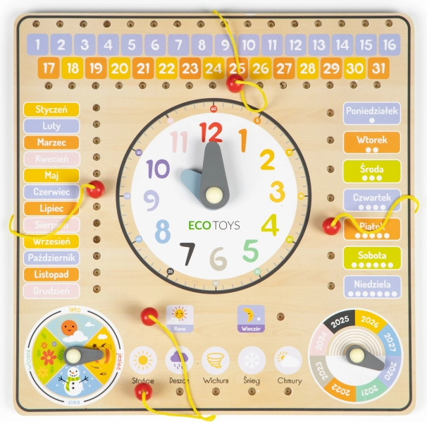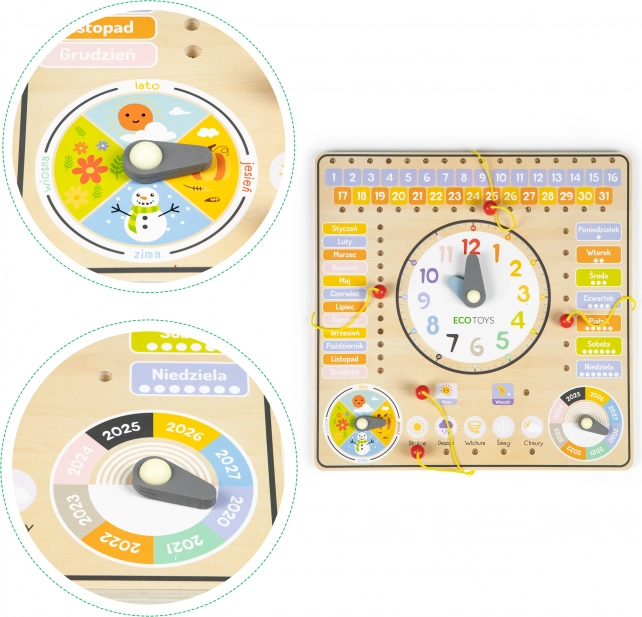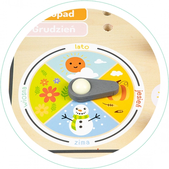 Het bord bevat Poolse benamingen, maar is ook ideaal voor Nederlandse kinderen dankzij de eenvoudige begrijpelijkheid en de duurzame houten constructie. Het helpt kinderen de diversiteit van de seizoenen beter te begrijpen met behulp van een roterende aanwijzer. Op het bord kan ook het jaar in het bereik 2020-2027 worden aangegeven.