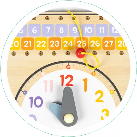 Laat je kinderen de wereld ontdekken met dit kleurrijke en veilige houten bord. Het leert kinderen de dagen van de week, de volgorde van dagen en de seizoensperioden te herkennen. Met speciale vakjes kunnen kinderen dagen in de kalender markeren met een koord en een houten knijpertje.