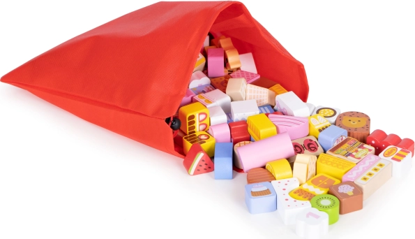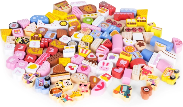 Bouw een zoete stad vol ijssalons, pâtisserieën en schattige details. Kleurrijke houten blokken met prints van eten, cijfers en letters ondersteunen spelenderwijs leren – tijdens het bouwen oefenen kinderen vanzelf het herkennen van vormen, kleuren en symbolen.