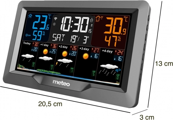 De slimme weerstation METEO SP101 met Wi‑Fi-verbinding maakt het mogelijk om het weer overal te volgen via de Smart Life (TUYA)-app. Het meet binnentemperatuur en buitentemperatuur en luchtvochtigheid, heeft geheugen voor min./max.-waarden, 5-daagse weersvoorspelling via internet, een UV-indicator, een wekker met sluimerfunctie en kan worden neergezet of aan de muur worden gehangen.