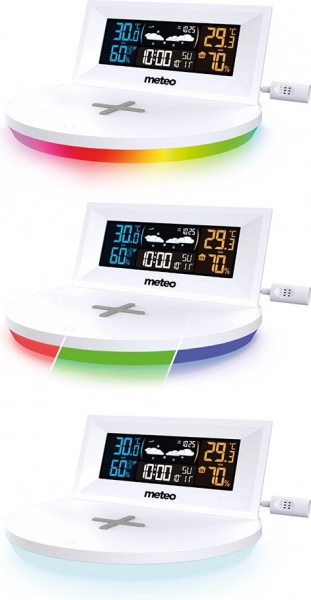 Dit innovatieve weerstation van Meteo is de perfecte keuze voor iedereen die een volledig overzicht van het weer wil en tegelijkertijd zijn apparaten draadloos wil opladen. Het stijlvolle ontwerp biedt de mogelijkheid om de lichtkleur aan je stemming aan te passen, evenals een multikleurenscherm voor gemakkelijke afleesbaarheid van de metingen.