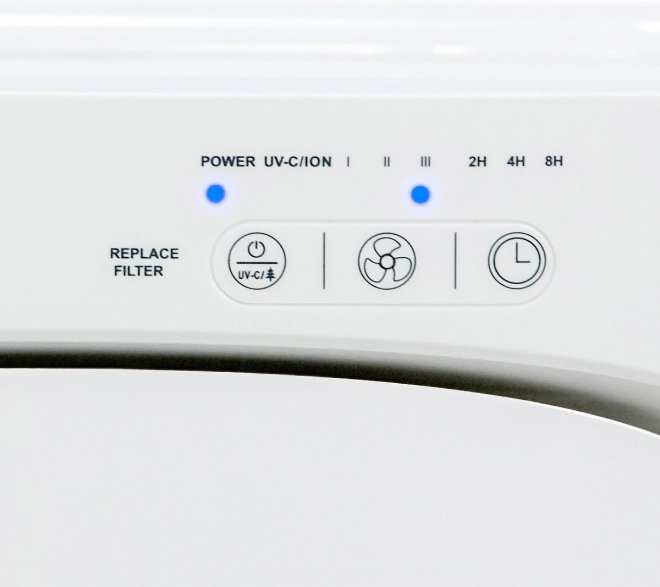 Stel eenvoudig 3 ventilatorsnelheden in, schakel UV-C en ionisatie in of kies een timer van 2/4/8 uur. De filtervervangingsindicator maakt onderhoud eenvoudig.