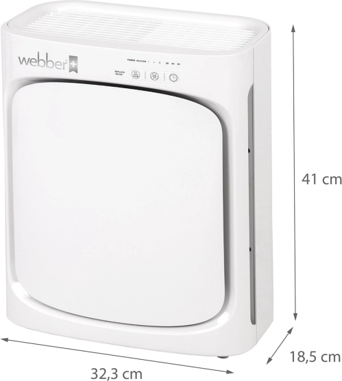 Krachtige WEBBER-luchtzuiveraar met HEPA 13-filter, ionisatie en UV-C-lamp verwijdert effectief stof, pollen, allergenen, geuren en zelfs virussen. Geschikt voor ruimtes tot 38 m², met een luchtstroom van 220 m³/h, stille werking van 30–50 dB en handige bediening van snelheden, timer en functies direct op het paneel.