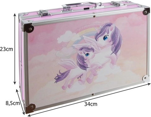 Ontdek de complete schilderset in een stevige roze koffer met eenhoornthema – ideaal voor kinderen en beginnende creatievelingen. Binnenin vind je alles voor tekenen, inkleuren en schilderen: viltstiften, kleurpotloden, oliepastels, waterverf en acrylverf plus praktische accessoires. Dankzij de organizer met vakjes blijven alle materialen overzichtelijk en veilig opgeborgen. Sterke metalen hoeken en sluitingen beschermen de inhoud tijdens het vervoeren.