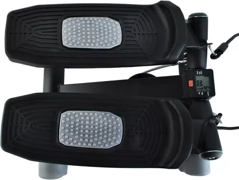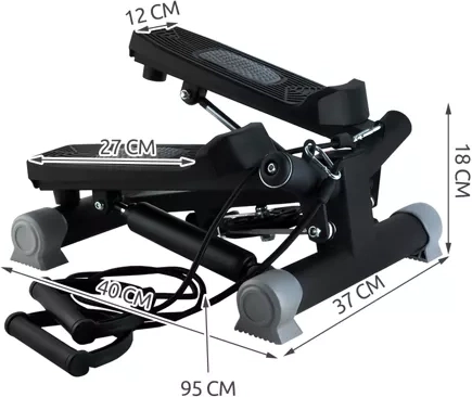 Compacte home-stepper voor effectief cardio en figuurvorming. Dankzij de schuine (twist) beweging versterk je benen en billen; de meegeleverde weerstandsbanden activeren het bovenlichaam en het LCD-scherm toont continu tijd, aantal stappen, calorieën en cadans. Verstelbare weerstand, antislippedalen en rubberen voetjes voor stabiliteit en bescherming van de vloer.