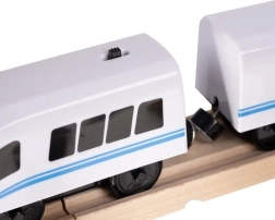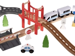 Houten treinbaan met brug en wagons