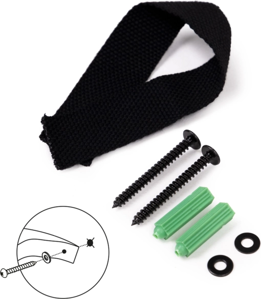 Het product bevat een speciale band en schroeven voor veilige bevestiging aan de muur, wat vooral belangrijk is voor de veiligheid van kinderen.