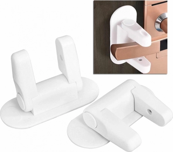 Beveiliging voor klinken die voorkomt dat kleine kinderen een deur of raam openen. Heeft een grote basis die een stevige installatie van de beveiliging achter de klink mogelijk maakt met behulp van dubbelzijdige tape. Het slot hecht stevig aan elk deur- of raamkozijn. De armen reiken tot 7 cm diep en voorkomen zo het openen van de klink. De dubbele knoppen op de armen maken snel ontgrendelen mogelijk voor bevoegde personen :)
