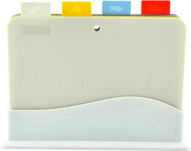 Set van vier gekleurde snijplanken met een bijbehorende standaard. De kleurcodering maakt het eenvoudig om ze aan een specifiek type voedsel toe te wijzen en voorkomt kruisbesmetting. Elke plank heeft bovendien een pictogram dat aangeeft waarvoor ze bedoeld is.
