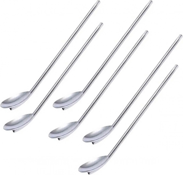 Set van 6 elegante stalen rietjes/lepelrietjes voor hergebruik. Elk rietje eindigt in een lepeltje, waardoor ze ook perfect zijn voor koffie en desserts. Ze geven elke, zelfs de meest veeleisende, party een perfecte uitstraling. Gemaakt van roestvrij staal voor jarenlang probleemloos gebruik. Verandert de smaak of geur van dranken/desserts niet.