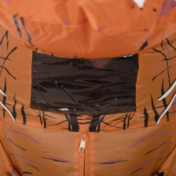 Ritssluiting aan de voorkant voor gemakkelijk omkleden, vastgenaaide handschoenen tegen verlies en een doorzichtig kijkvenster onder de bek voor goed zicht.
