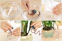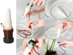 Dompel de kegel 15 minuten onder in water, vul de slang met water en plaats de kegel in de aarde. Het waterreservoir moet hoger zijn dan de bloempot om een constante toevoer van water te garanderen.