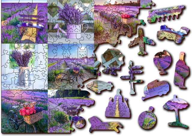 Leg de puzzel aan de hand van het kleurrijke beeld van lavendelvelden of probeer de achterzijde met een herhalend patroon voor puur vormenpuzzelen.