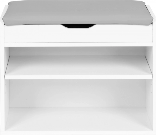 Praktische en moderne witte schoenenkast met een comfortabele bank voor gemakkelijk aan- en uittrekken en voor het opbergen van schoenen en kleine voorwerpen in uw hal of slaapkamer. Bank van eco-leer zorgt voor comfort, terwijl de opbergklep en twee verstelbare legplanken voldoende ruimte bieden voor verschillende spullen.