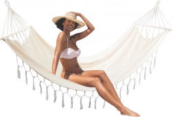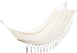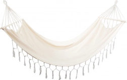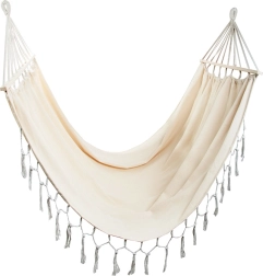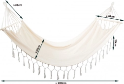 Geniet van ultieme ontspanning in de buitenlucht met deze elegante boho hangmat voor twee personen. Dankzij het ruime ligvlak van 200 × 150 cm, een draagvermogen tot 200 kg en decoratieve franjes biedt hij stijlvolle comfort in de tuin, op het terras of binnenshuis. Duurzame stof, houten spreidstokken en sterke ophangtouwen garanderen stabiliteit en eenvoudig ophangen.