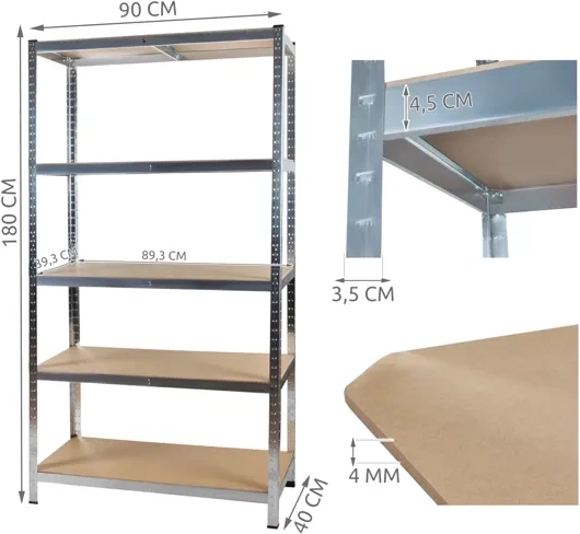 Stabiel rek van verzinkt staal en dikke MDF-planken kan hoge belastingen en dagelijks gebruik aan. Elke plank is versterkt met een dwarsverbinding voor extra stabiliteit, rubberen doppen op de poten beschermen de vloer en voorkomen wegglijden. Dankzij openingen om de 3 cm stel je de plankhoogte precies af op de opgeslagen items.