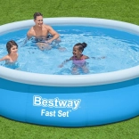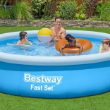 Het opblaasbare bovengrondse zwembad BESTWAY Fast Set is de ideale keuze voor snelle verfrissing in de tuin. De montage is in enkele minuten klaar – blaas de bovenste ring op, laat water in en de wanden komen vanzelf omhoog. Dankzij het stevige materiaal met duurzame afwerking is het bestand tegen dagelijks gezinszwemplezier.