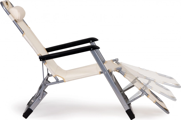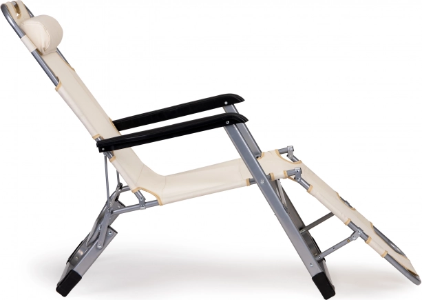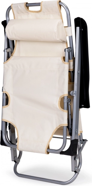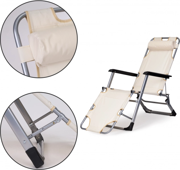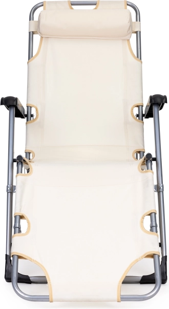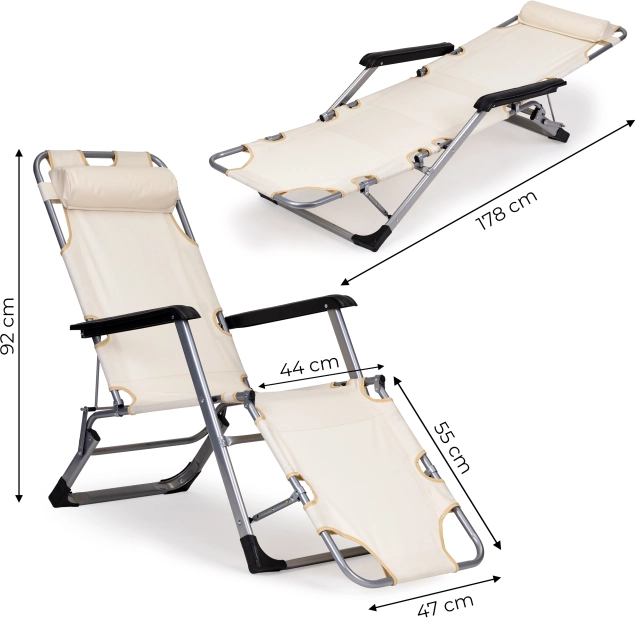 Praktische 2-in-1: stoel en ligbed – in een oogwenk uit te klappen tot volledig vlak voor comfortabel zonnen of relaxen. De beige bekleding past in elke buitenruimte en het robuuste metalen frame zorgt voor een lange levensduur, ook bij veelvuldig buitengebruik.