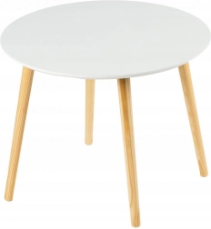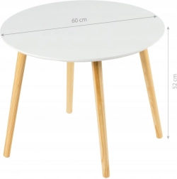 Elegante Scandinavische salontafel met een diameter van 60 cm, met een strak wit blad en naturel houten poten. Ideaal voor de woonkamer of leeshoek, met een stabiele houten constructie, een duurzaam MDF-blad en eenvoudige montage in enkele minuten.