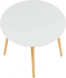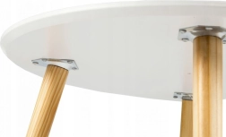 De minimalistische tafel in Scandinavische stijl past perfect in moderne interieurs. Het ronde blad van gelakt MDF is bestand tegen krassen en vuil, waardoor het gemakkelijk schoon te houden is. De drie massieve grenen poten zorgen voor hoge stabiliteit en zekerheid bij dagelijks gebruik.