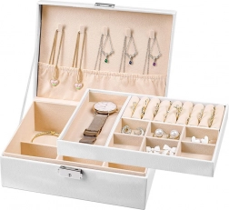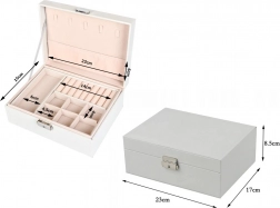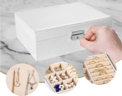 Deze stijlvolle sieradendoos van hoogwaardig eco-leer in het wit biedt royale ruimte en een doordachte indeling voor al je accessoires. Het zachte fluwelen interieur beschermt sieraden tegen krassen, terwijl het metalen slot met sleutel zorgt voor veilige bewaring.