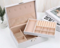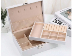 De bovenste laag bestaat uit vakken voor ringen en kleine items, haakjes voor kettingen en een elastisch vak. Door het rooster te verwijderen ontstaat er ruimte voor grotere items zoals horloges, armbanden of brillen. Dankzij de slimme indeling heb je alles overzichtelijk binnen handbereik.