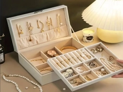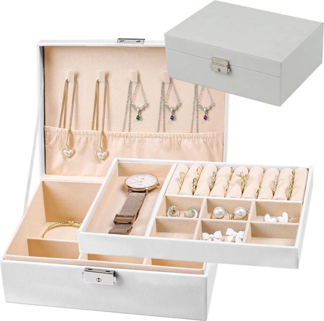 • Grote capaciteit – tot 16–24 ringen, haakjes voor kettingen, compartimenten met meerdere kamers.