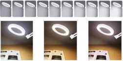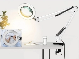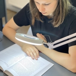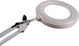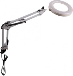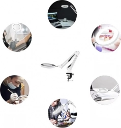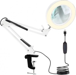 Praktische tafellamp met loep en ringvormige LED-verlichting voor precisiewerk in cosmetica, manicure, ambacht en elektronica. Biedt 3 lichtkleuren (warm, neutraal, koud), 10 helderheidsniveaus, een stabiele metalen arm met veren en een klemhouder voor aan het tafelblad. Glazen lens 3× vergroting levert een scherp beeld zonder vervorming. Voeding via USB met controller op de kabel.
