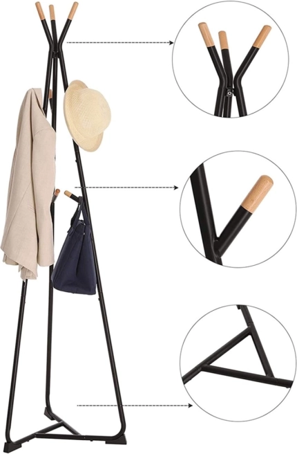 De robuuste metalen constructie en de driehoekige voet zorgen voor uitstekende stabiliteit, ook bij hogere belasting. Veilige voetjes beschermen de vloer tegen krassen en haken op verschillende hoogtes maken het gebruik gemakkelijk voor kinderen en volwassenen. De compacte afmetingen 49 × 49 × 172 cm passen perfect in kleinere entrees.