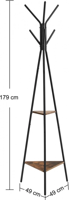 Stijlvolle staande kapstok in loftdesign met een combinatie van metaal en hout, geschikt voor in de hal, garderobe, woonkamer en gang. Biedt 6 afgeronde haken voor jassen en accessoires, 2 praktische planken en een stabiele driepootvoet. Het stevige ijzeren frame en duurzaam MDF zorgen voor een lange levensduur, terwijl beschermende pootjes de vloer beschermen.