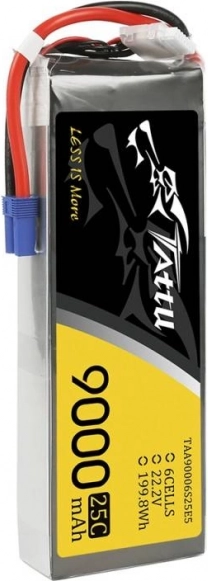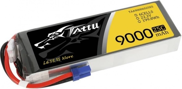 Krachtige Tattu batterij met een capaciteit van 9000mAh levert stabiele en betrouwbare energie voor veeleisende toepassingen. Met zes cellen en een spanning van 22,2V is hij ideaal voor apparaten die hogere prestaties vereisen.