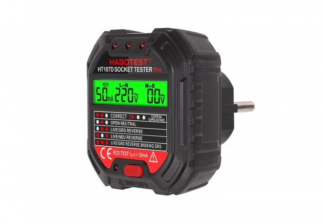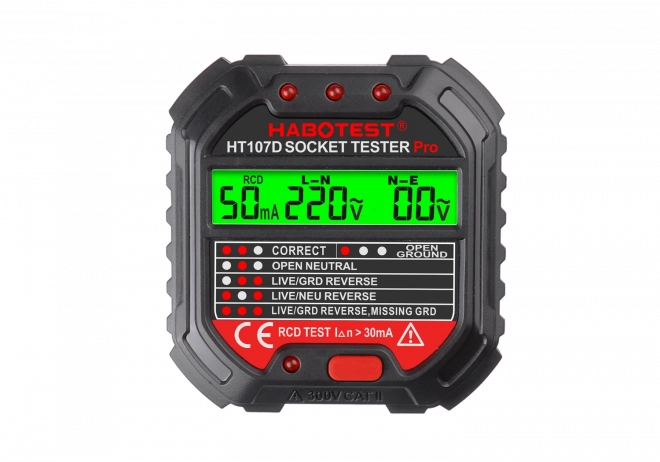 Zorg voor veiligheid en inzicht in de staat van uw stopcontacten. De HABOTEST HT107D biedt een overzichtelijk LCD-scherm met achtergrondverlichting dat de actuele spanning en het resultaat van de bedradingstest weergeeft. De LED-indicatoren aan de bovenzijde geven duidelijk aan of de bedrading correct is, of de beschermingsgeleider ontbreekt, de nulleider is onderbroken of er andere fouten zijn. Met één druk op de knop voert u ook een functionele RCD-test uit.