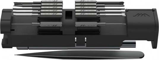 - Handgreep 11,5 cm, 14 bits (0.6, SL1.5, SL2.5, 0.8, 1.2, PH000, PH, T1, T2, T5, 2.5 Cap, Y0.7), roestvrijstalen pincet 11,5 cm, etui met magnetiseerder en bakje voor schroeven