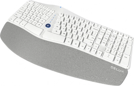 Geniet van maximaal comfort tijdens het typen met het draadloze ergonomische toetsenbord DELUX GM901D. Het biedt een gebogen vorm voor een natuurlijke handpositie, een geïntegreerde polssteun van aangenaam materiaal, verbinding met tot 3 apparaten via Bluetooth 3.0/5.0 en 2,4 GHz, stille en duurzame toetsen en praktische functie-sneltoetsen voor media en volume.