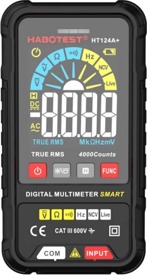 De compacte digitale multimeter HABOTEST HT124A+ is een betrouwbare hulp voor zowel thuis als professioneel meten. Hij biedt True RMS, nauwkeurige meting van AC/DC-spanning, weerstand en frequentie, en beschikt over NCV contactloze spanningsdetectie, Live Test, praktische displayverlichting en een zaklamp. Dankzij het overzichtelijke grote display en de eenvoudige bediening is hij ideaal voor snel en veilig testen.