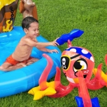 De kleurrijke opblaasbare octopus en speelelementen maken van het badje een interactief waterspeelveld.