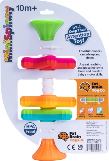MiniSpinny is een slimme sensorische speelgoedervaring die kinderen boeit met beweging, kleur en aanraking. Drie schijfjes met verschillend aantal “pootjes” draaien soepel langs een spiraalstaaf en creëren tijdens het naar beneden glijden een fascinerend visueel effect. Getextureerde oppervlakken nodigen uit tot verkennen en stimuleren spelenderwijs tastzin en coördinatie.