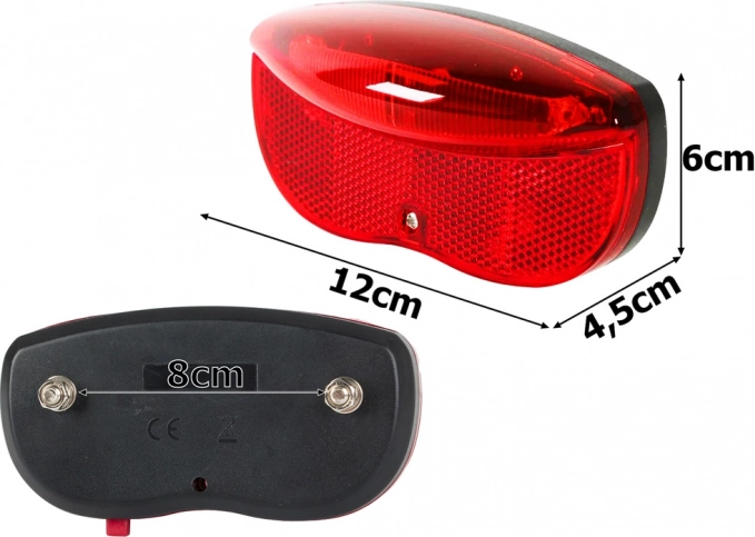 De installatie is snel en probleemloos – het licht wordt met twee bouten bevestigd op de meeste gangbare dragers (boutafstand 8 cm). De robuuste behuizing kan regen, kou en trillingen aan, en de voeding wordt geleverd door overal verkrijgbare 2× AA-batterijen, die zijn inbegrepen. Het product is CE-gecertificeerd.