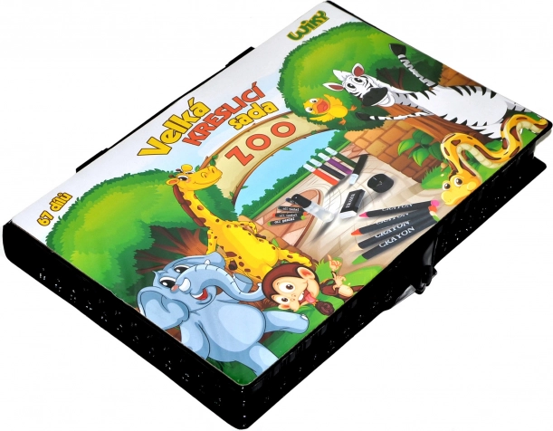 Creatieve tekenkoffer ZOO met 67 delen: 12 viltstiften, 12 kleurpotloden, 12 waskrijtjes en 12 oliepastels, waterverf, penseel en meer. Geweldig cadeau voor jonge kunstenaars.