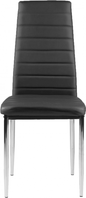 Zwarte bekleding van eco-leer in combinatie met verchroomde poten creëert een strakke, moderne uitstraling die je gemakkelijk kunt afstemmen op de eettafel en accessoires.