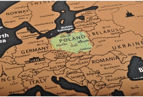 Decoratieve kaart waarmee reizigers bezochte landen kunnen markeren door de bovenlaag te verwijderen. Daaronder verschijnen kleurrijke vlaggen en details van afzonderlijke landen.