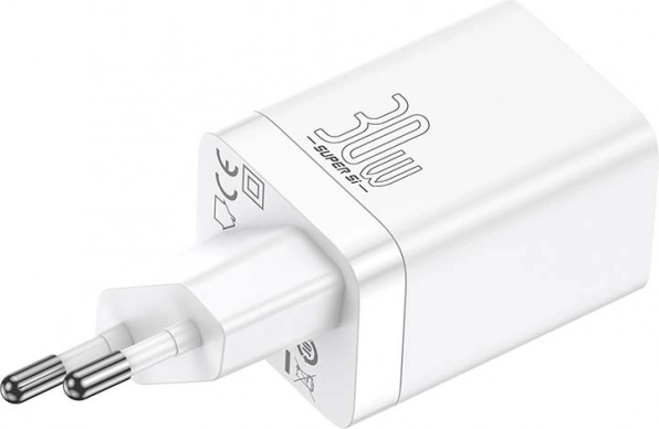De compacte netlader BASEUS Super Si Pro met een vermogen van 30 W biedt twee poorten – USB‑C en USB‑A – voor het gelijktijdig opladen van twee apparaten. Ondersteunt snel laden PD 3.0 en QC 3.0, heeft brede compatibiliteit met smartphones, tablets en kleine elektronica, en dankzij intelligente beveiliging is veilig in gebruik thuis en onderweg (AC 100–240 V).