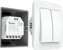 Compacte slimme schakelaar SONOFF Dual R3 met twee onafhankelijke kanalen en energiebewakingsfunctie voor het bedienen van verlichting, stopcontactcircuits en jaloezieën of rolluiken. Verbindt via Wi‑Fi 2,4 GHz, werkt met de eWeLink-app, biedt tijdschema’s en is TÜV-gecertificeerd voor extra veiligheid.