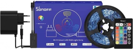 Slimme LED‑lichtstrip Sonoff L2 Lite 5 m met RGB, Wi‑Fi en Bluetooth. Bediening via eWeLink, spraak (Google/Alexa), scènes en timers. Eenvoudige zelfklevende installatie.