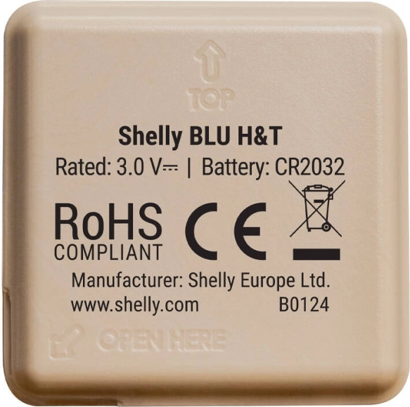 Voeding via één CR2032-batterij met een levensduur tot 3 jaar. Dankzij de afmetingen 37 × 37 × 10 mm en het lage gewicht van 13 g plaatst u hem eenvoudig op elk vlak oppervlak.