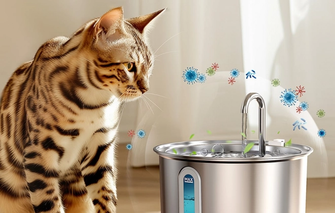 Dankzij het gebruik van 316 roestvrij staal blijft het water onbesmet en is de fontein eenvoudig schoon te maken. Alle onderdelen zijn vaatwasmachinebestendig, wat het onderhoud vereenvoudigt. Bovendien kunt u het waterniveau controleren dankzij het transparante venster met LED-verlichting.