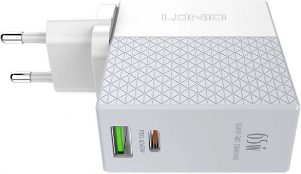De LDNIO 65W oplader is uitgerust met niet alleen een USB‑A-, maar ook een USB‑C‑poort, waardoor gelijktijdig opladen van twee apparaten mogelijk is met een vermogen tot 65 W. Ondersteuning voor PD- en QC3.0‑protocollen garandeert efficiënt en veilig opladen, ideaal voor moderne apparaten.